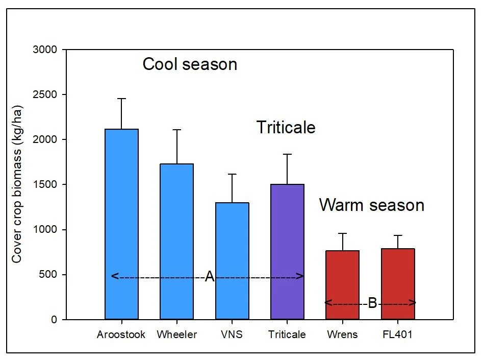Figure 1. Average aboveground biomass for early-planted cover crops, sampled in April 2019, from Lexington, KY. Error bars represent one standard error. Cover crops were planted on 9/12/18 and are grouped into cool-season cereal rye (blue), warm-season cereal rye (red), and triticale (purple). Groups with the same capital letter are not significantly different. No differences in biomass were detected for late-planted cover crops (not shown).
