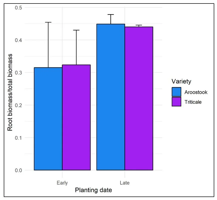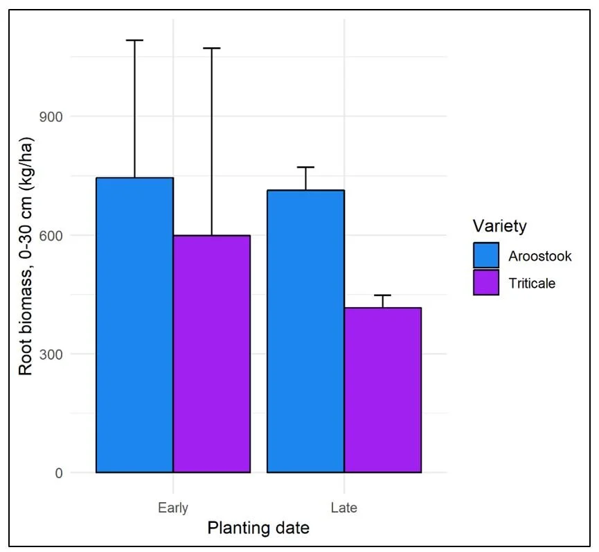 Figure 2. Root biomass at the time of cover crop termination for early- and late-planted Aroostook cereal rye and triticale. Data are derived from two of the four replicates because root data collection is still in progress. Error bars represent ± one standard error.