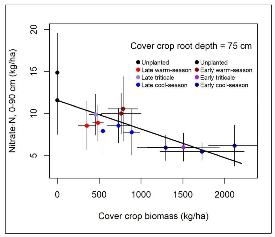 Figure 4. The amount of nitrate-N present in the soil profile at the time of cover crop termination in response to cover crop biomass level. Colors represent experimental treatments (late = late-planted; early = early-planted; warm-season = Wrens Abruzzi and FL401; cool-season = Aroostook, Wheeler, and Variety Not Stated). Error bars represent ± one standard error.